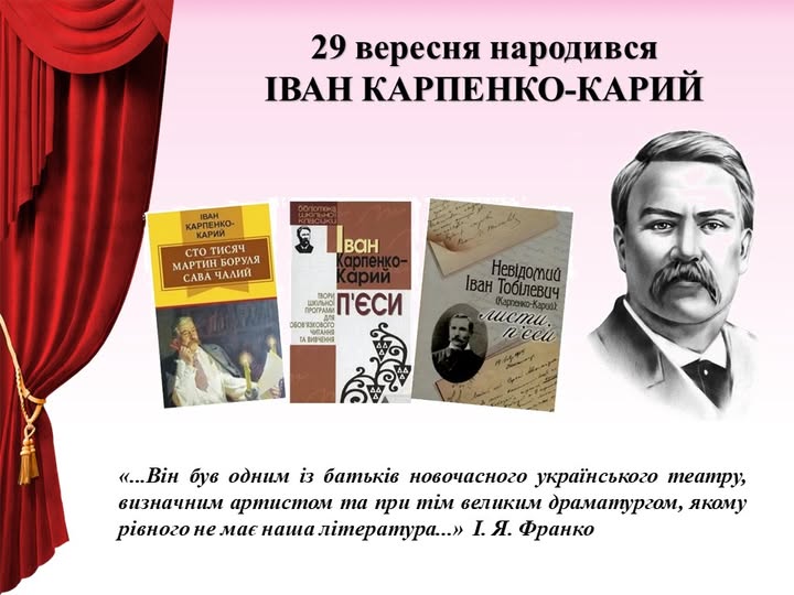 Іван Карпович Тобілевич, знаний під творчим псевдонімом Іван Карпенко-Карий — видатний український письменник, драматург, актор і театральний діяч кінця XIX—початку XX століття. Він належить до блискучої плеяди корифеїв українського професійного театру. Творчість Карпенка-Карого стала важливою віхою в розвитку національної драматургії і театрального мистецтва. Його п’єси, сповнені глибокого психологізму, філософічності, соціальної гостроти, підняли українську драму на якісно новий рівень. А створені ним як актором сценічні образи увійшли до золотого фонду українського театру.